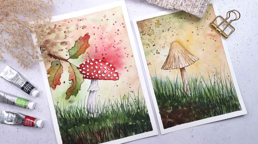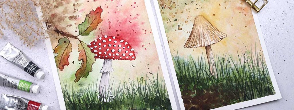 In meinem Live-Kurs malen wir gemeinsam online und in Echtzeit wunderbare Pilze vor einem herbstlichen Hintergrund. Spannende Details sorgen für den Wow-Faktor.