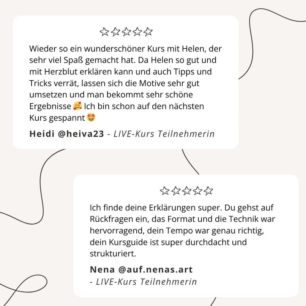 - Malen in Echtzeit. In einem angenehmen Tempo zeige und erkläre ich dir alle Schritte. Sodass du gut mitmachen kannst und am Ende deine eigenen Kunstwerke geschaffen hast.