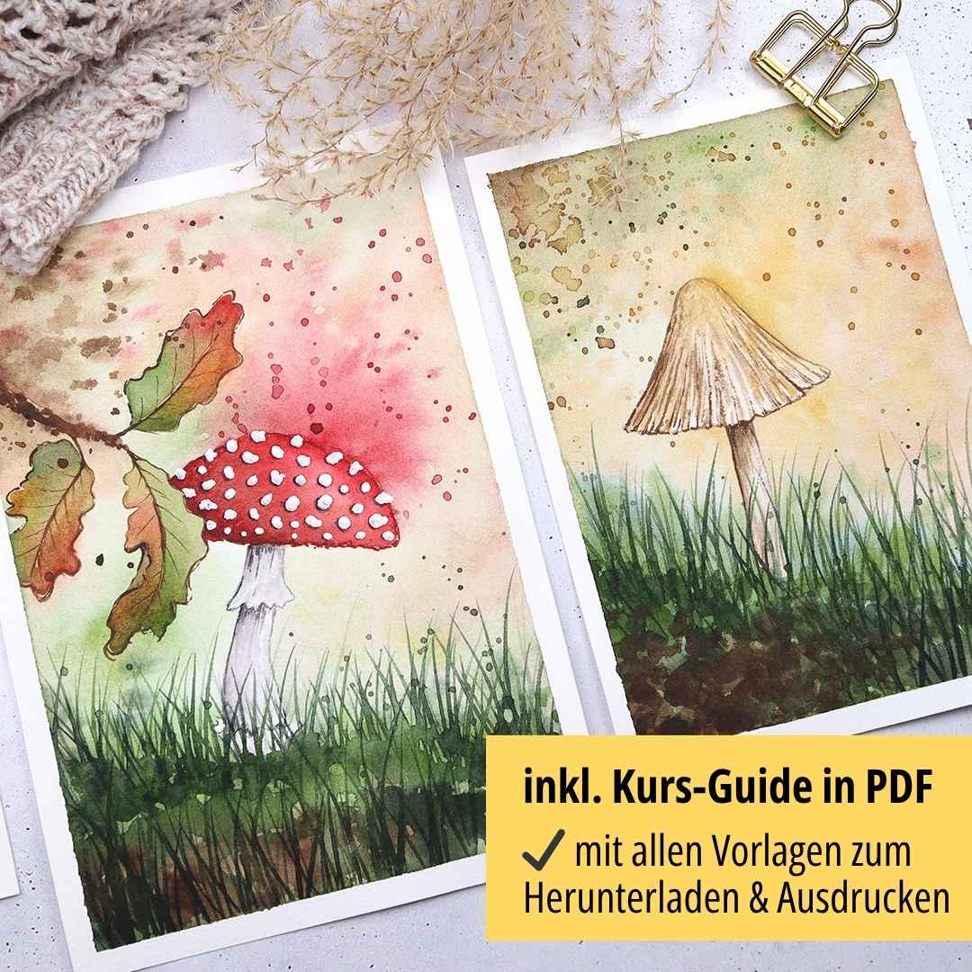 In meinem Live-Kurs malen wir gemeinsam online und in Echtzeit wunderbare Pilze vor einem herbstlichen Hintergrund. Spannende Details sorgen für den Wow-Faktor.